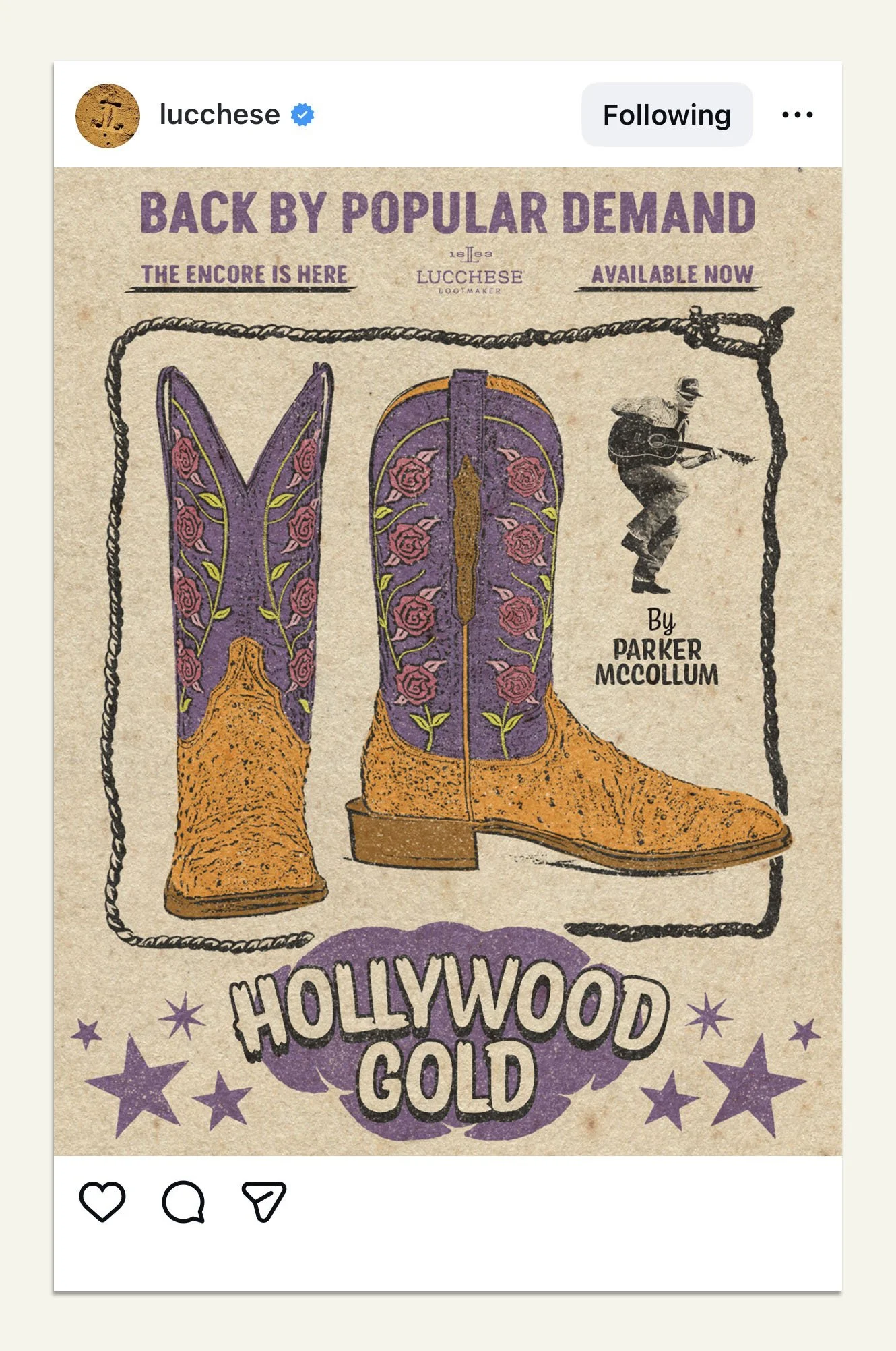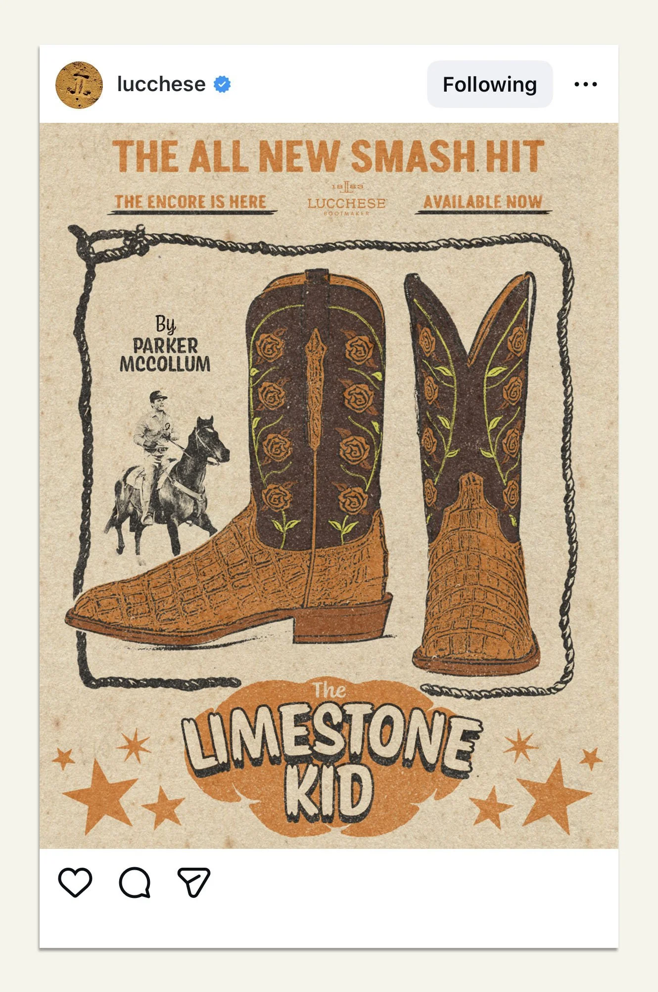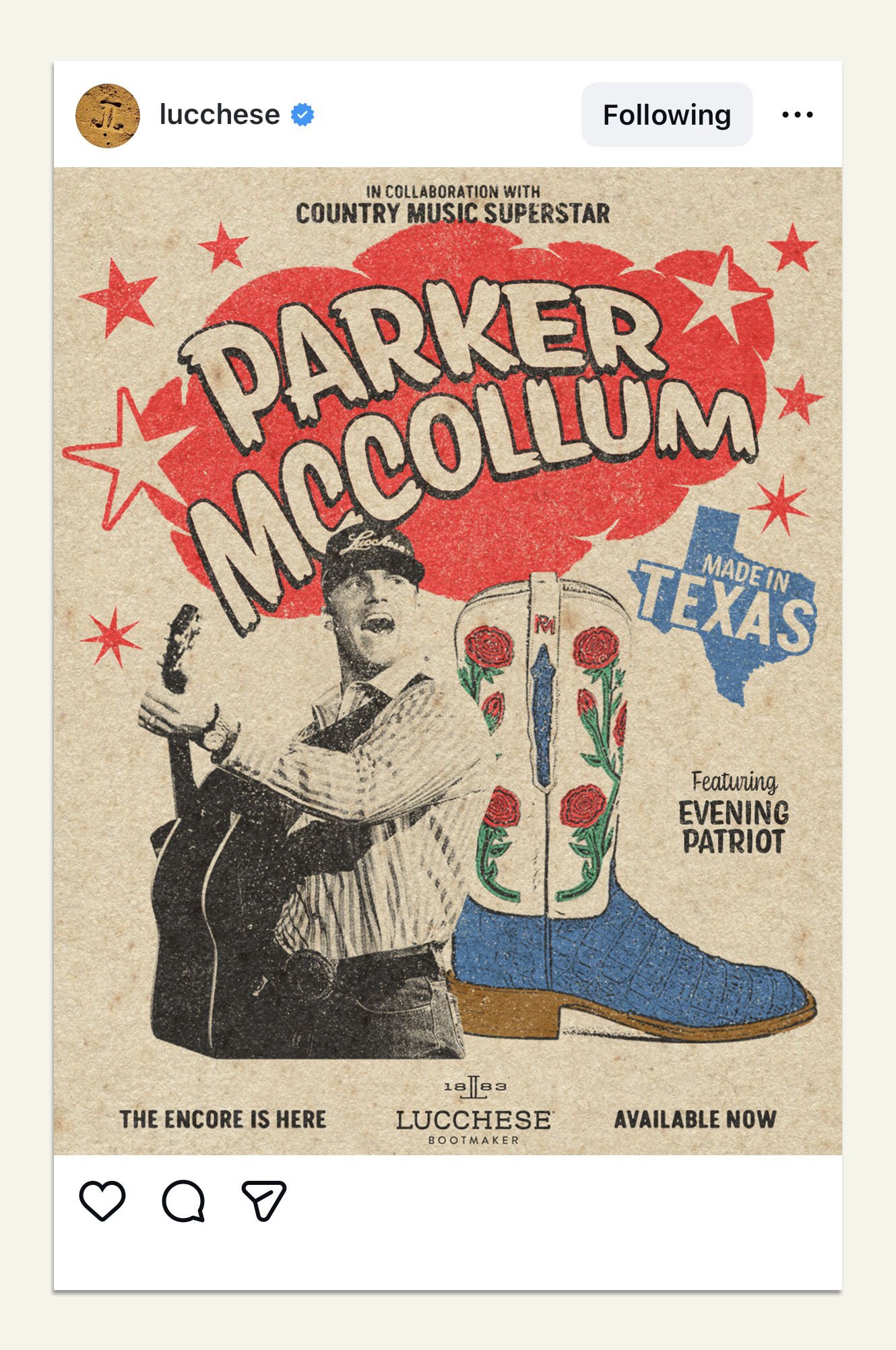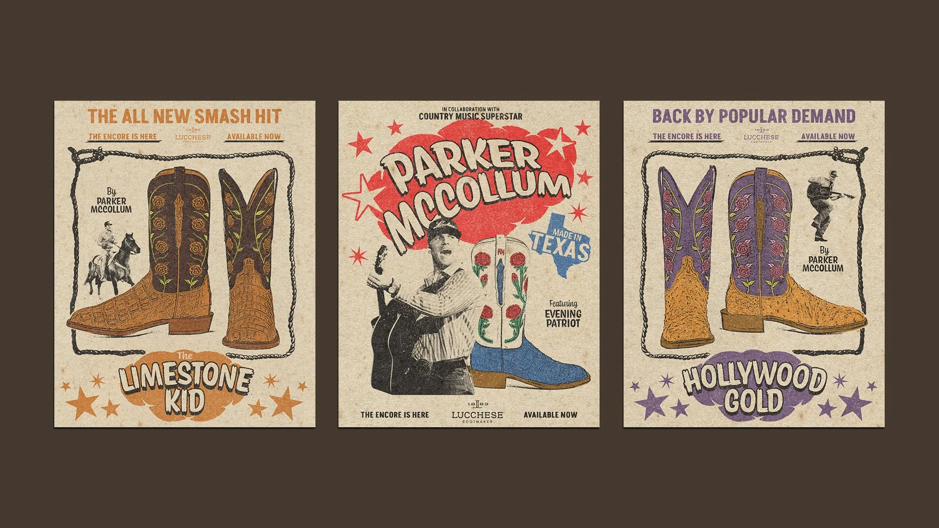 Taking inspiration from vintage mid-century concert posters, we were tasked with creating a suite of on-brand social assets to promote Parker McCollum’s signature line of boots, while staying true to Lucchese’s brand ethos.